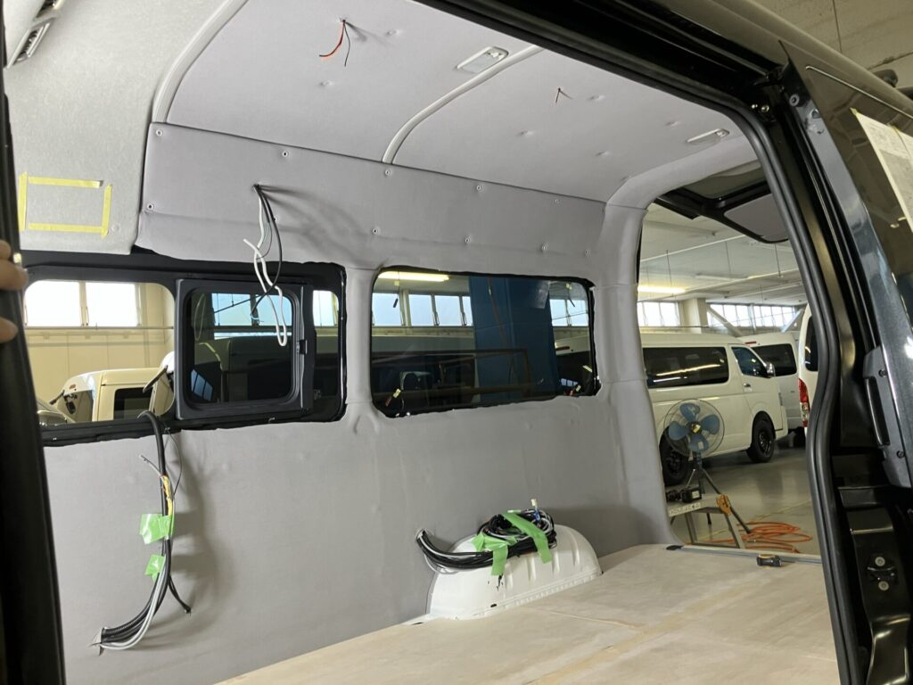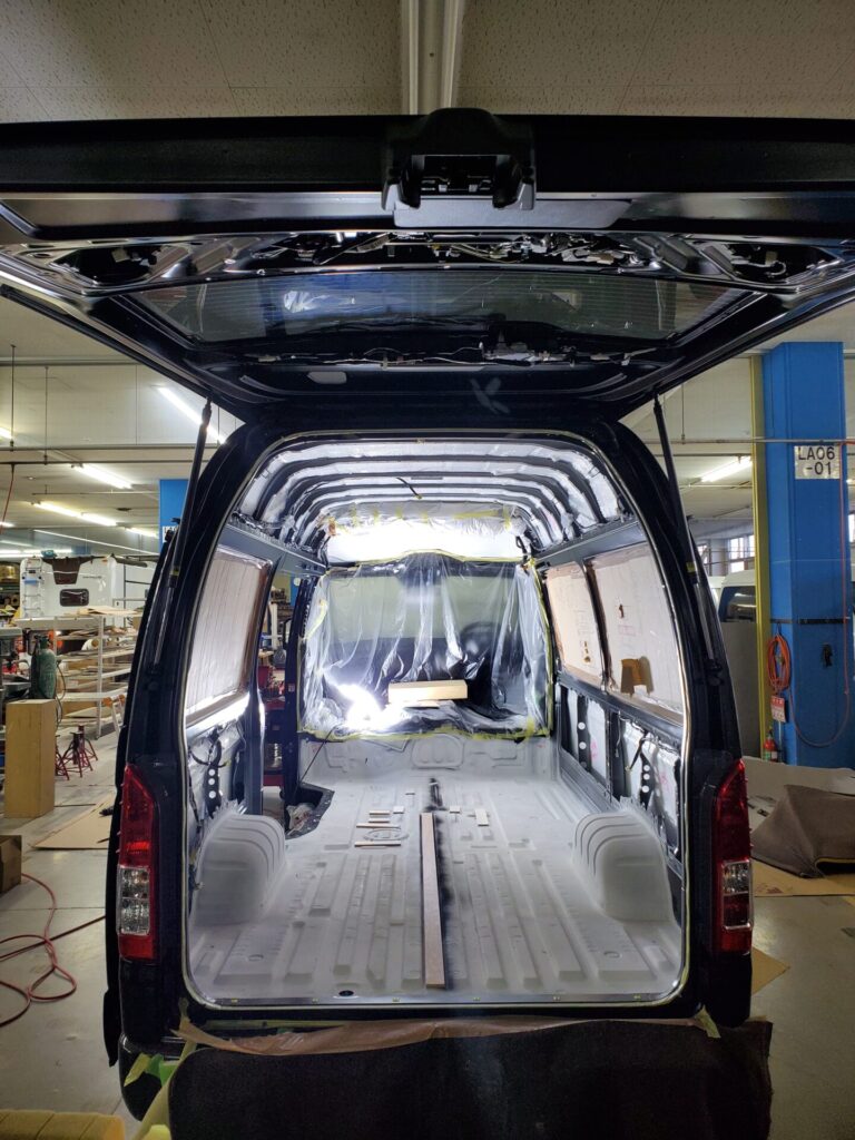 今回はワンオフ制作のベース車両となるハイエースバンDXのハイルーフを新車でお車からご注文いただき、ご希望の仕様のお打ち合わせ、お見積り、CG画像確認、ご注文、製作、ご納車となりました。ベース車両となるハイエースの入庫待ち期間が約6か月、製作期間約4か月を経て、この度のご納車となりました。