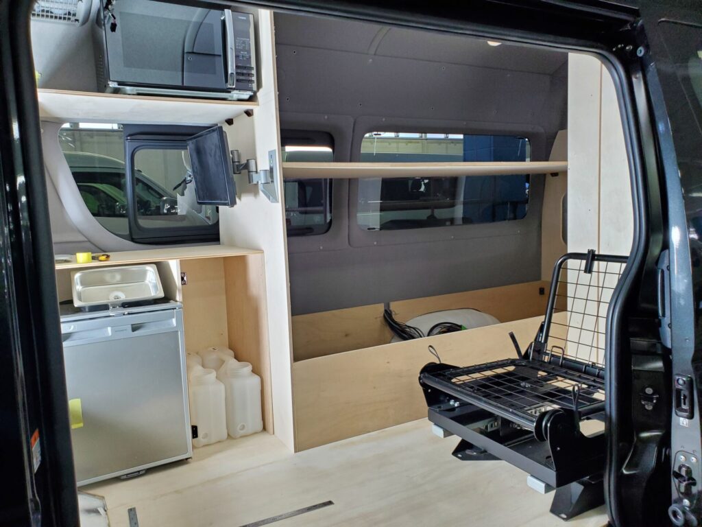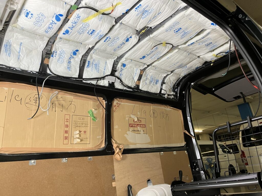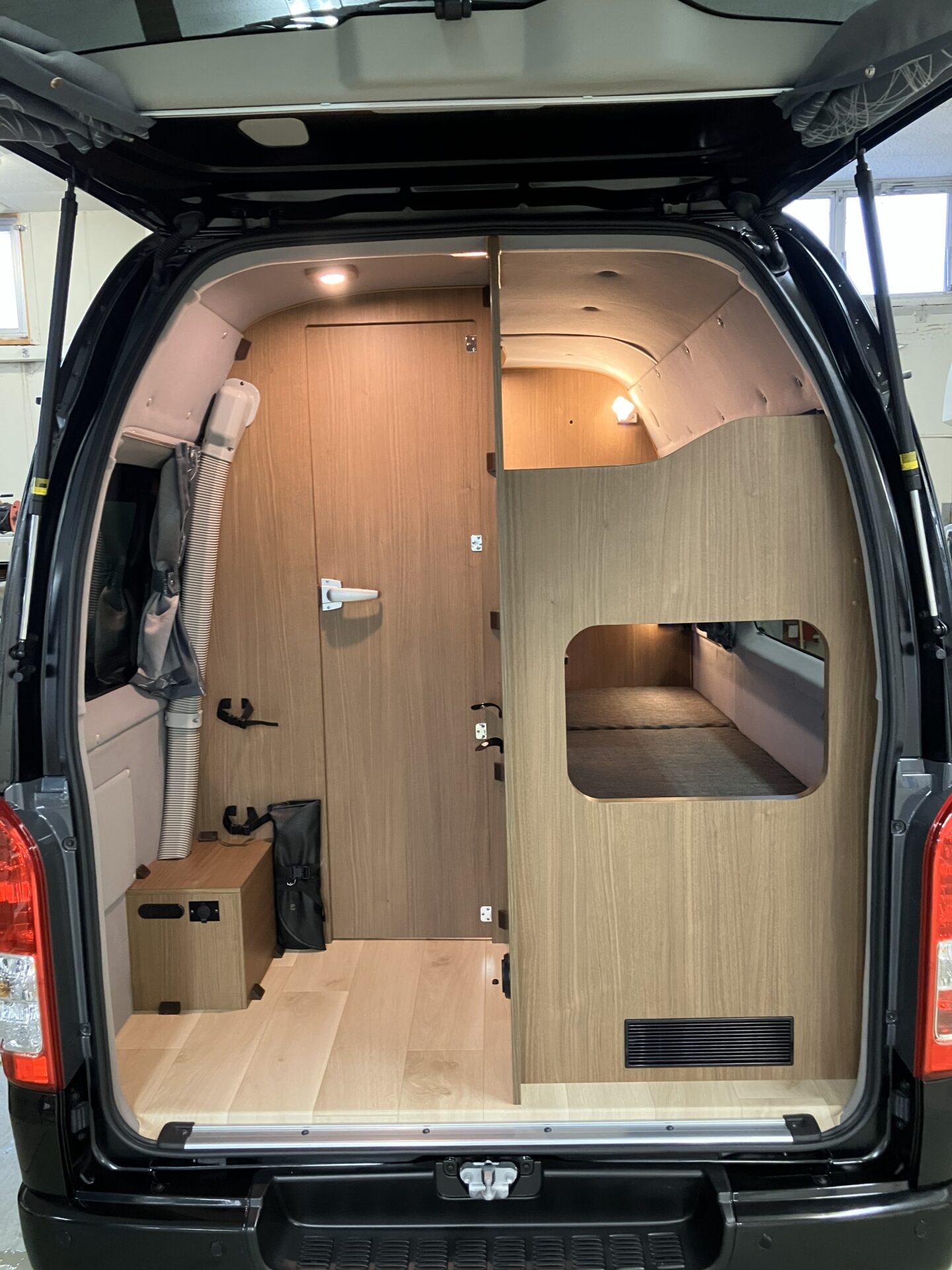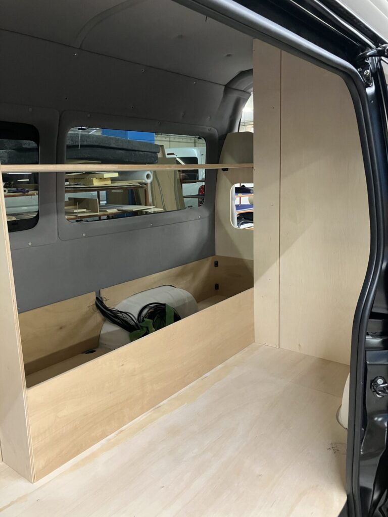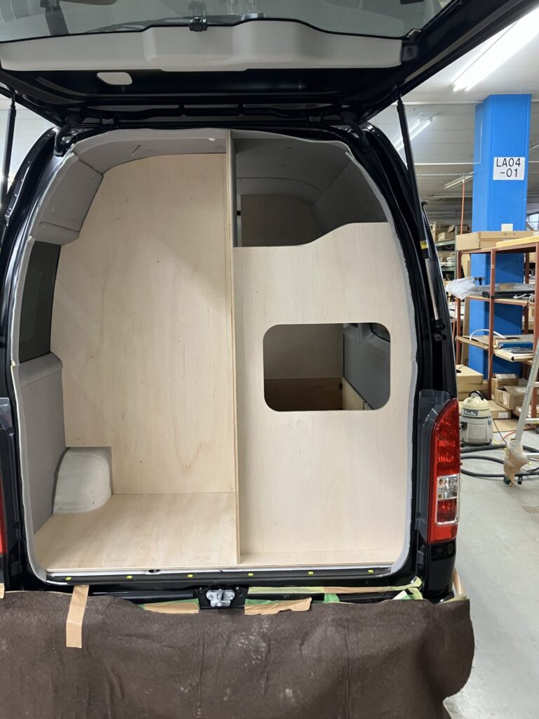ハイエースロングのハイルーフのバンコン製作は初めてでしたので、家具の試作を沢山しました。イメージに少しでも近づけるために、試作レイアウトをご確認頂いたり、お客さまにもご協力頂き大変感謝しております。