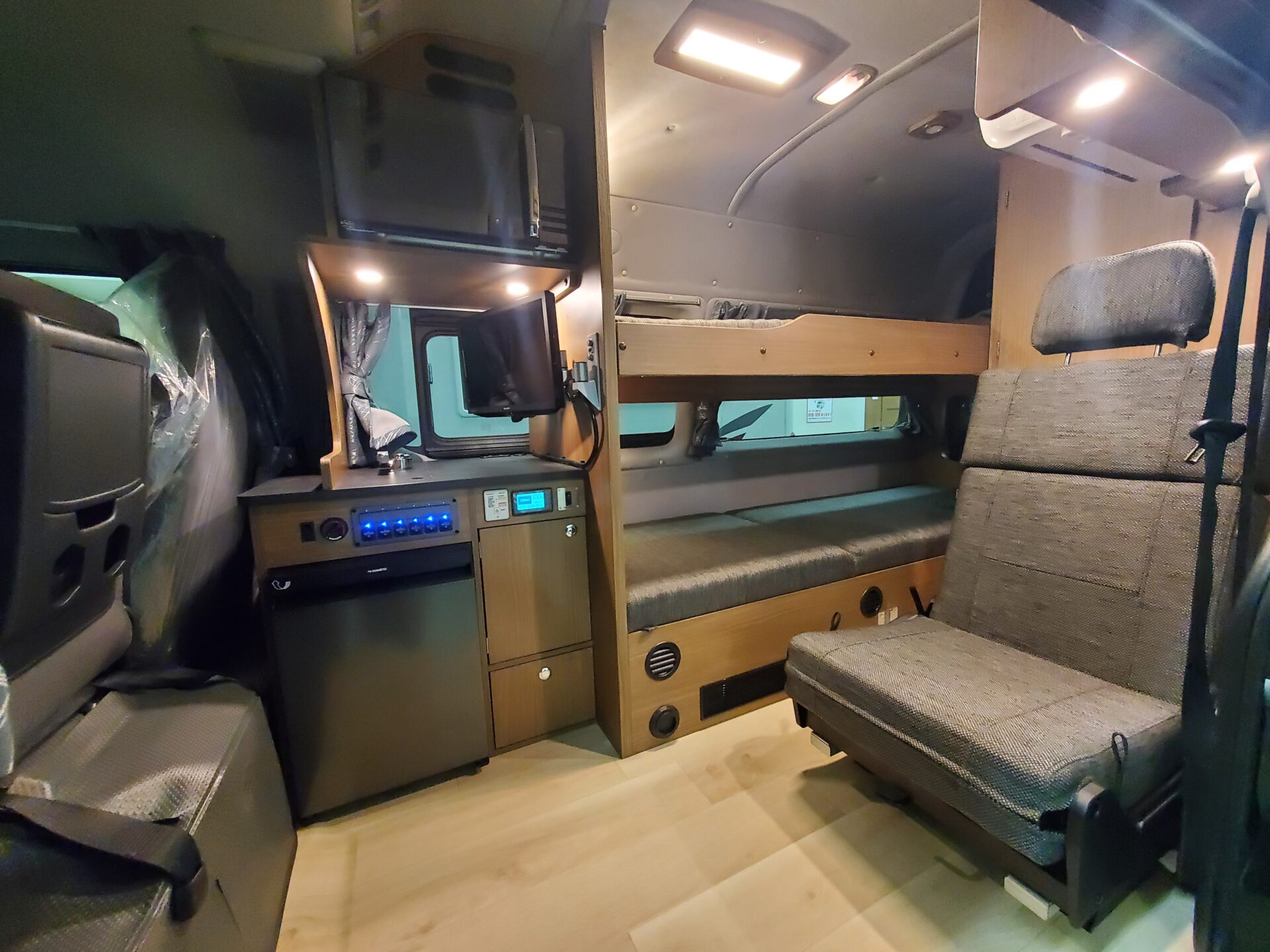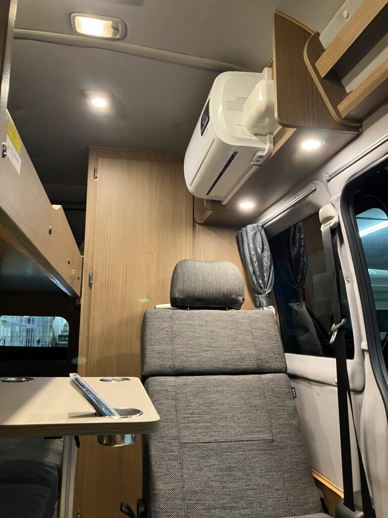 - 2段ベッド(就寝長2000mm)・DCクーラー・FFヒーター・一人掛け前向きシート・マルチルーム・リチウムバッテリー(300Ah)・走行/外部充電器